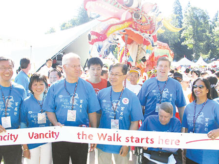 (前排左起)中僑基金會(huì)主席胡以鈞、婦女廳長(zhǎng)張杏芳、卑詩(shī)省長(zhǎng)金寶爾、中僑主席關(guān)元生、溫哥華市長(zhǎng)蘇利文、國(guó)會(huì)議員尼娜格雷沃爾(Nina Grewal)為百萬(wàn)行擔(dān)任前鋒部隊(duì)。(《明報(bào)》圖)
