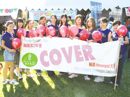 10位入圍麗晶活力新星的美少女參觀明報(bào)攤位。(《明報(bào)》圖)
