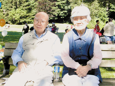 91歲的陳伯元(左)和妻子參加百萬(wàn)行活動(dòng),享受史園的陽(yáng)光。(《明報(bào)》圖)