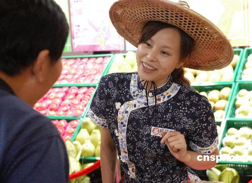 | 臺灣秋季水果為主題的(臺灣)“好又多”中國大陸連鎖店水果展臺,二00五年九月八日在北京中國展覽中心舉辦的“第十二屆亞太零售商大會暨中國國際商品博覽會”上,以果品種類繁多博得觀眾好評。圖為著臺灣裝的水果小姐,請觀眾品嘗“番石榴、蓮霧、楊桃、文旦等寶島水果。前臺灣“好又多”總部在中國大陸剛好設(shè)立了一百家水果連鎖店,臺灣水果在大陸越來越大暢銷。作者:鄒憲