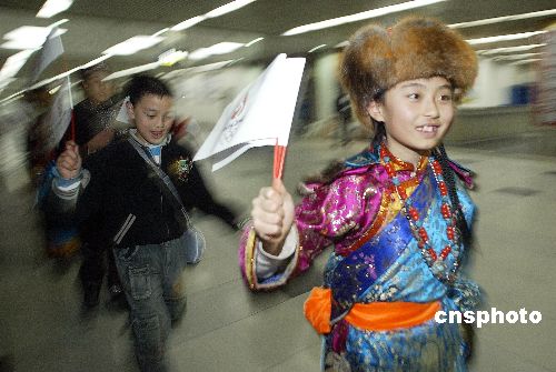 | 十一月八日,六十六名來自甘肅的北京二○○八奧運(yùn)會(huì)吉祥物西部小使者乘坐火車抵達(dá)北京,這些小使者有漢、回、滿、白、蒙古、藏、哈薩克、東鄉(xiāng)等多個(gè)民族,他們將在七位老師的帶領(lǐng)下,在北京度過一周的奧運(yùn)之旅。圖為作為小使者的藏族小姑娘扎西卓瑪跟隨隊(duì)伍抵達(dá)北京。作者:盛佳鵬