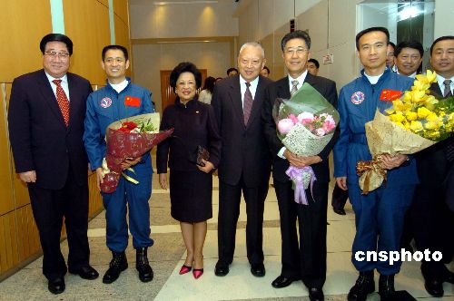 11月29日,全港政協(xié)副主席董建華伉儷、中聯(lián)辦主任高祀仁[左]等在中聯(lián)辦會見“神六”代表團(tuán),并與“神六”代表團(tuán)團(tuán)長胡世祥[右二]及航天員費(fèi)俊龍[右]、聶海勝[左二]出席座談會。 作者:洪少葵