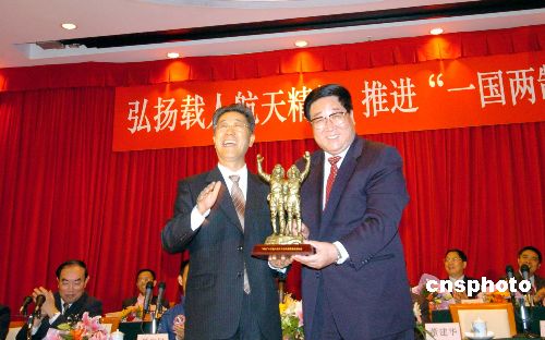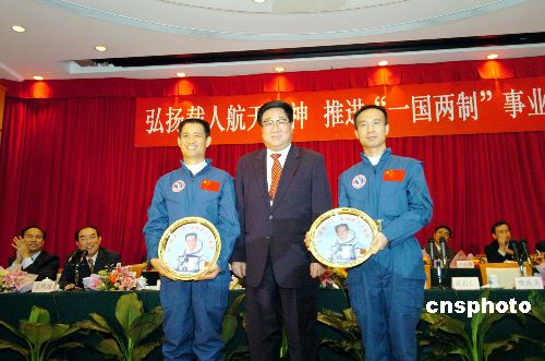中聯(lián)辦主任高祀仁[中]向費(fèi)俊龍[右]、聶海勝贈送紀(jì)念品。 作者:洪少葵