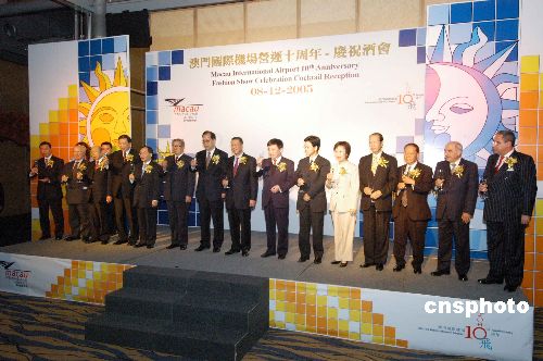 | 八日,澳門國際機場專營股份有限公司在旅游塔會展娛樂中心為“澳門國際機場營運十周年”舉行慶祝酒會,澳門特首何厚鏵、澳門中聯(lián)辦副主任何曉衛(wèi)、中國民航總局副局長高宏峰等出席酒會并向在場嘉賓祝酒。 作者:梁永強