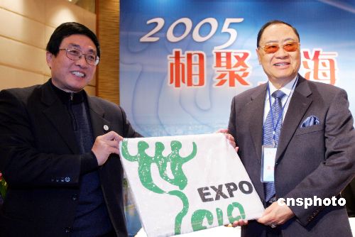 | 十二月十四日,全球華僑華人關(guān)注上海世博會(huì)——二○○五“相聚上海共謀發(fā)展”活動(dòng)在上海舉行,本次活動(dòng)以“關(guān)注世博、宣傳世博、支持世博”為主題,吸引了來(lái)自二十五個(gè)國(guó)家和地區(qū)的百家僑團(tuán)領(lǐng)袖及代表參加。圖為世界華商聯(lián)合總會(huì)會(huì)長(zhǎng)蔣一成(圖右)代表海外僑領(lǐng)從上海世博局副局長(zhǎng)黃耀誠(chéng)(圖左)手中接過(guò)“上海世博會(huì)宣傳旗”。作者:湯彥俊