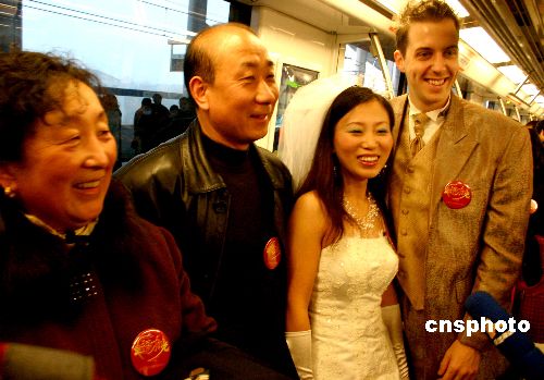 2006年元旦,一場(chǎng)浪漫的“幸福時(shí)光——全國(guó)首次地鐵集體婚禮”在南京舉行,六對(duì)新人乘上“開(kāi)往愛(ài)情的地鐵” ,參加永生難忘的集體婚禮。新人及親屬登上一節(jié)專門(mén)布置的喜慶地鐵婚車,向同車乘客散發(fā)喜糖,接受祝福。作者:阿董