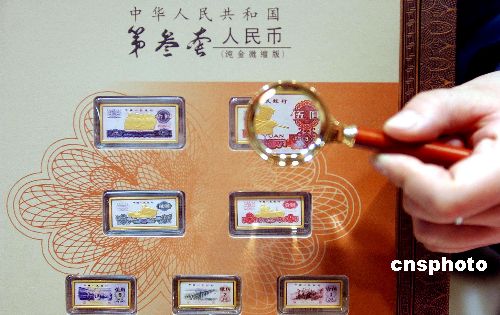 | 第三套人民幣的純金微縮版,一月十三日在北京菜百公司首發(fā),吸引眾多市民購買。這是中國首套用黃金鑄造的人民幣藏品。它由七枚純金的微縮版人民幣和七枚第三套人民幣紙幣以及四枚硬幣組成,其中金幣采用百分之九十九的純金鑄造,重五十克,全套人民幣面值十八塊八,售價一萬六千六百元。全球版限量發(fā)行八千套,北京地區(qū)限量二百套。作者:韓藝冰