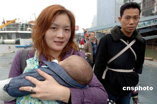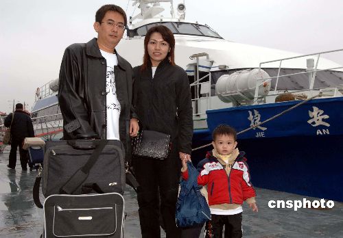 | 1月20日上午9時10分,廈門“捷安”號高速客輪滿載248位回鄉(xiāng)過春節(jié)的臺胞離開廈門和平碼頭前往金門。這是2006年廈金航線春運第一天首趟班輪。廈金航線的春運從1月20日開始至2月13日結(jié)束,每天6條船往返12個航班,預計春運首日將有2000人次往返廈門、金門之間,整個春運期間將有4萬人次通過廈金“兩門”直航往返祖國大陸和臺灣之間。圖為在廈門從事泰國外貿(mào)的吳宗動先生和妻子楊玉萍帶著2歲多的小孩吳柏霖,在碼頭上準備乘坐“捷安”號高速客輪直航金門,然后再搭乘立榮航空公司的班機返回臺灣過年。作者:黃少毅