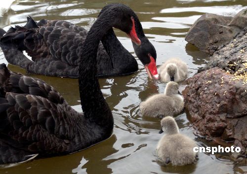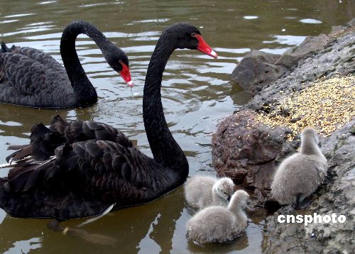 | 2月5日,3只“丑小鴨”隨著黑天鵝父母覓食。入春以來(lái),重慶野生動(dòng)物世界天鵝湖里多了3只幼雛黑天鵝,它們跟在黑天鵝父母身邊,時(shí)而覓食,時(shí)而嬉戲。黑天鵝是觀賞鳥類珍貴品種,體重5-8公斤,全身羽毛深黑,嘴為深紅色,頭頸約占全身總長(zhǎng)的一半,翅上長(zhǎng)有如風(fēng)帆一般卷曲的婚羽,極為美麗。幼雛1-3天后可隨親鳥下水活動(dòng),在親鳥帶領(lǐng)下覓食,不過它們還是穿著一件灰色外套,就是人們常說的“丑小鴨”!俺笮▲啞苯q毛換成羽毛的順序?yàn)轭^——翅——全身。最初的絨毛呈淺灰色,以后換成灰黑色,顏色逐漸變黑,嘴變紅且尖端可見白斑,最后變成成年黑天鵝一樣的黑色。作者:陳仕川