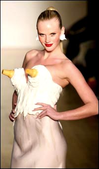 | 中新網(wǎng)2月13日電 據(jù)外電報(bào)道,在剛剛過去的紐約時(shí)尚周中,著名時(shí)裝設(shè)計(jì)師杰里米·斯科特(Jeremy Scott)創(chuàng)造出來的“食品”系列服裝堪稱整個(gè)秀的最大亮點(diǎn)。只見一個(gè)個(gè)模特身上的衣服均以食物為造型,看看名模Anne Vyalitsyna這身奇特的胸衣,竟然是兩個(gè)冰淇淋的蛋卷筒扣在了胸上,白色的衣服宛如流下來的冰淇淋,讓人不得不稱贊設(shè)計(jì)師的創(chuàng)意,但是,Anne的表情和這件“冰淇淋胸衣搭配在一起,真是讓人不舒服!