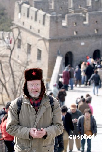 | 2月末,北京春寒料峭。八達(dá)嶺長(zhǎng)城上一位外國(guó)游客正戴著雷鋒帽攀登長(zhǎng)城。今春,雷鋒帽在中國(guó)的年輕人中頗為流行,今天在八達(dá)嶺長(zhǎng)城上有很多中外游客都帶著雷鋒帽,一位英國(guó)游客表示,戴著雷鋒帽登長(zhǎng)城,既有濃烈的中國(guó)色彩又可以擋風(fēng)御寒,他很喜歡。作者:廖攀
