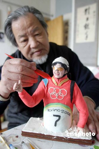 | 2月27日,山東省民間面塑大師何曉錚對(duì)制作的面塑作品《冬奧健兒韓曉鵬》做最后的修整。韓曉鵬在冬奧會(huì)奪得自由式滑雪男子空中技巧比賽的冠軍,為中國(guó)男子冬奧金牌實(shí)現(xiàn)零的突破,何曉錚花費(fèi)2天時(shí)間做出《冬奧健兒韓曉鵬》的面塑作品,該作品高24公分,寬21公分,用2公斤面制成,表現(xiàn)了韓曉鵬奪冠后的喜悅。作者:龔輝