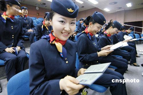 | 中國南方航空公司新招收的三十名韓國籍乘務(wù)員正在喜看培訓(xùn)考核證書。這批韓籍空姐二00五年十二月二十七日在廣州南航乘務(wù)培訓(xùn)中心開始接受客艙服務(wù)、空中醫(yī)學(xué)、機型知識等理論和實際操作的培訓(xùn)、考核,二00六年二月二十七日結(jié)束培訓(xùn),已經(jīng)全部通過嚴格的考核,即將由帶飛老師帶領(lǐng)上機實習(xí),帶飛合格后將在韓國首都首爾駐勤飛行。作者:林宇定