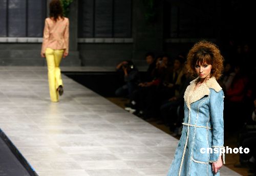 | 三月二十七日,愛(ài)登堡英倫風(fēng)尚休閑男裝2006/2007年秋冬流行趨勢(shì)發(fā)布會(huì)在北京舉行,時(shí)裝設(shè)計(jì)將傳統(tǒng)英式特質(zhì)與現(xiàn)代感相互交融,回歸八十年代的潮流,并以一種注重簡(jiǎn)單、安逸、活力及主宰力融合的男性形象出現(xiàn),展現(xiàn)出優(yōu)雅、簡(jiǎn)潔、時(shí)尚的英倫風(fēng)情。圖為兩位女模特為男裝發(fā)布會(huì)助陣,共同演繹英倫風(fēng)情。 作者:盛佳鵬