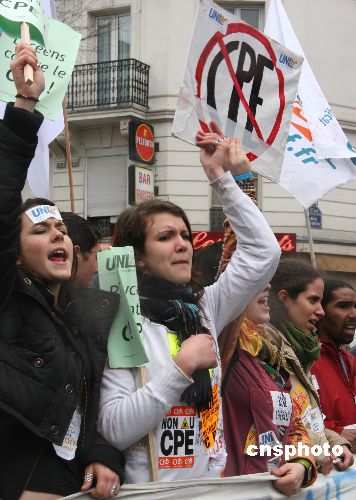 | 當?shù)貢r間3月28日,學(xué)生在巴黎街頭高舉標語呼吁撤消“首次雇用合同”的口號(上圖)。醞釀已久的巴黎28日大游行如期舉行,來自大中學(xué)校的學(xué)生和工會組織為反對“首次雇用合同”走上街頭。事先組織者宣傳游行人數(shù)將達一百萬,而當日工會公布的數(shù)字是七十萬,但警方則說只有九萬多。下圖為一個巧借游行主題的婦人在游行途經(jīng)街邊賣水。她頭頂一個盆,旁邊立有一塊標語牌,上寫“CPE(首次雇用合同)”:0歐元,姜水:2歐元。此舉贏得不少游行者照顧她的生意。作者:鐘誠