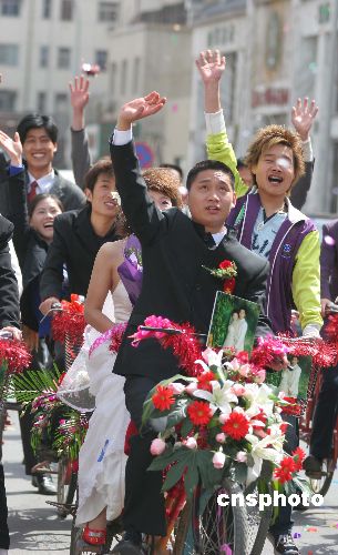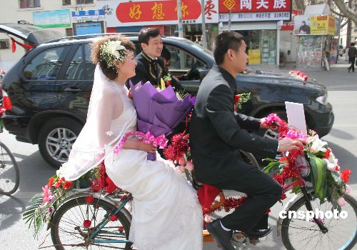 | 2006年3月28日,一個(gè)由20多輛掛彩的自行車組成的迎親隊(duì),在鄭州市緯五路上迎接一對(duì)新人。當(dāng)天,一對(duì)外來(lái)鄭州務(wù)工青年采用騎自行車方式舉行婚禮游走鄭州街頭,引起過(guò)往市民的關(guān)注。據(jù)了解,該對(duì)新人采取單騎方式結(jié)婚,主要是倡導(dǎo)節(jié)省、環(huán)保。作者:陳代述