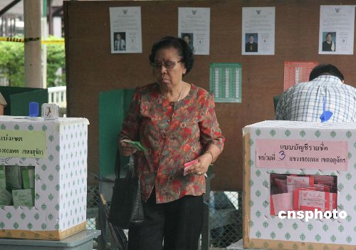 | 四月二日,在曼谷一個投票站,一位泰國婦女一手拿著選政黨的選票,一手拿著選選區(qū)候選人的選票走到投票箱前,為選出她心目中的政府領(lǐng)導(dǎo)人做出艱難抉擇。因為民主黨、泰國黨、大俄政黨中眾黨三大反對黨的抵制大選和要求塔信辭職的反政府集會持續(xù),塔信領(lǐng)導(dǎo)的泰愛泰黨由此在十八個參選政黨中一枝獨秀,許多選區(qū)只有一個泰愛泰黨的候選人參與競選。作者:羅欽文