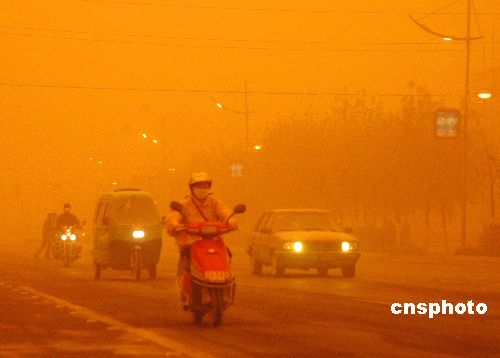 | 2006年4月10日,新疆吐魯番遭遇強沙塵暴襲擊,沙塵遮天蔽日,空氣中彌漫著濃濃的嗆人味道,天空呈現(xiàn)橘紅色,車輛不得不開著大燈慢慢行駛。據(jù)當?shù)貧庀蠛铜h(huán)保部門信息,這次強沙塵暴是受西西伯利亞強冷空氣入侵和當?shù)馗珊瞪儆甑挠绊懶纬傻模O(jiān)測數(shù)據(jù)顯示空中總懸浮顆粒物濃度為19.85mg/m3,能見度在5米左右,創(chuàng)歷史最高。這次強沙塵暴對人們生活和農(nóng)作物生長產(chǎn)生不利影響。作者:劉健4509