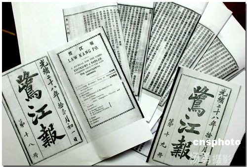 | 在福州著名譜牒研究學者林偉功家里,林偉功向記者展示他發(fā)現(xiàn)的連戰(zhàn)祖父連橫104年前主撰的12篇福州新聞。這12篇新聞分別刊載在光緒二十八年(1902年)十一月初一和十一日的《鷺江報》上。連戰(zhàn)祖父連橫先生那時是這家報社的主筆,負責新聞的采寫。這兩份報紙上還蓋有福州鄉(xiāng)賢、新中國成立后第一任國家文物局局長鄭振鐸的收藏印章。圖為12篇新聞刊在104年前的《鷺江報》上。作者:楊勇