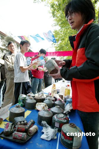 | 4月22日,“2006珠峰大行動(dòng)”工作人員在北京師范大學(xué)向?qū)W生介紹從珠峰帶回來的廢棄物品。當(dāng)日是第37個(gè)“世界地球日”,“2006地球第三極珠峰大行動(dòng)” 在北京開展首都高校聯(lián)動(dòng)環(huán)保簽名活動(dòng),并開始正式面向社會(huì)招募志愿者。在今年的活動(dòng)中,志愿者除了完成拉薩至珠峰大本營(yíng)沿線的環(huán)境清潔工作外,還將為地球海拔最高的村落帶去太陽能電力設(shè)施,使生活在那里的37戶村民能享受到現(xiàn)代文明為生活帶來的便利。作者:杜洋