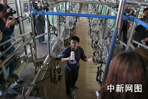在杜爾伯特泰康奶牛飼養(yǎng)示范廣場,網絡媒體記者了解現(xiàn)代化的榨乳設備和流程。