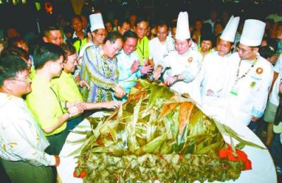 由于烹調(diào)工具和設(shè)施有限,大馬最大巨粽的“大鍋飯”工程,須分批漸進(jìn)地置入電子蒸爐蒸煮。(馬來西亞光明日?qǐng)?bào)圖)