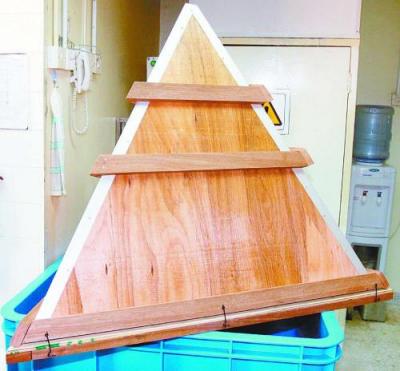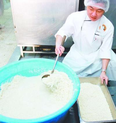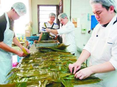 霸級(jí)巨粽采用特別訂制的三角板制成三角模型,把食材壓縮,以塑造出扎實(shí)的“粽型”。(馬來西亞光明日?qǐng)?bào)圖)