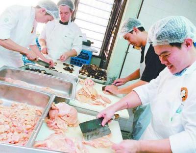累積逾10年經(jīng)驗(yàn)的資深廚子默契分工,刀法利落切割雞肉香菇,晃眼功夫便大功告成。(馬來西亞光明日?qǐng)?bào)圖)