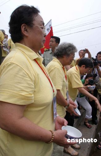 | 7月26日,重走長征路的開國元勛子女代表左權將軍之女左太北(左一)、彭德懷元帥侄女彭鋼(左二)、黃克誠大將之女黃梅(左三),湘江撒酒泣祭72年前血染湘江的紅軍英魂!扒橄甸L征路--開國元勛子女重走長征路”當天抵達廣西興安縣紅軍長征突破第四道封鎖線指揮部舊址三官堂,懷著崇敬的心情瞻仰湘江戰(zhàn)役紅軍遺跡,祭奠烈士英靈。1934年,紅軍在長征途中以犧牲5萬多的慘重代價英勇血戰(zhàn),突破蔣介石親自調動30萬大軍設置的第四道封鎖線,渡過湘江。中新社發(fā) 田地 攝