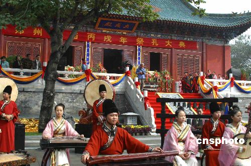 | 九月二十八日上午,鄭州市政府在新修復(fù)的鄭州文廟恢復(fù)舉行傳統(tǒng)祭孔大典,主祭者統(tǒng)一身著漢服,采用三獻(xiàn)禮的傳統(tǒng)祭祀方式,將中原傳統(tǒng)漢文化與祭孔儀式相結(jié)合。中新社發(fā) 胡珂 攝