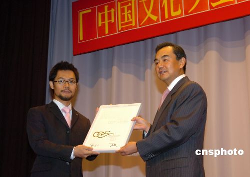 | 十月十九日,中國駐日本大使王毅在大使館向“二00六中國文化節(jié)”標(biāo)識獲選設(shè)計者、家住日本的公司職員野村和幸表示祝賀。當(dāng)日下午,中國駐日本大使館舉行文化節(jié)標(biāo)識發(fā)布會,通過公開征集,從日本各地三百七十六位市民設(shè)計方案中,野村和幸的設(shè)計最終獲選。該設(shè)計方案巧妙地應(yīng)用中日兩國民眾都十分熟悉的中國經(jīng)典藝術(shù)人物孫悟空的騰云意象和此次文化節(jié)的英文表記字母交織而成。“二00六中國文化節(jié)”由中國文化部和中國駐日使館共同主辦,將于二00六年十一月起在日本舉行,是中國近年來在日舉辦的規(guī)模最大的文化交流活動。中新社發(fā) 王健 攝