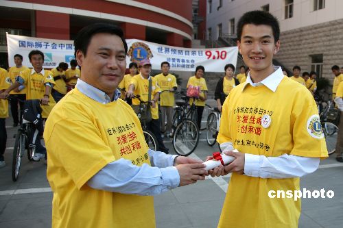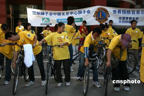 | 9月10日,是第4個“世界預(yù)防自殺日”。由北京獅子會與北京吉利大學(xué)一支30名學(xué)生作為志愿者的團隊以騎單車的形式進行宣傳。自2003年9月10日世界衛(wèi)生組織和國際自殺預(yù)防協(xié)會共同確定的全球第一個“預(yù)防自殺日”之后, 每年9月10日,世界各地都會在這一天開展相關(guān)的宣傳活動,以此傳播與預(yù)防自殺有關(guān)的知識,借以喚起社會各界對自殺問題的關(guān)注,挽救那些試圖自殺者的生命,共同提高公眾對自殺問題重要性以及降低自殺率的意識。中新社發(fā) 李堃 攝