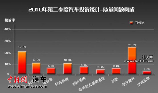 報告顯示,投訴統(tǒng)計的具體比例為:發(fā)動機占22.8%;變速器占12.0%;離合器占6.6%;轉(zhuǎn)向系統(tǒng)占10.8%;制動系統(tǒng)占8.1%;前后橋及懸架系統(tǒng)占5.4%;輪胎6.0%;車身附件及電氣占25.5%;空調(diào)系統(tǒng)2.8%。