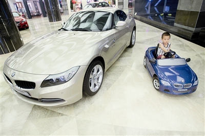 今天上午,翠微廣場一層寶馬生活館內(nèi),兩輛兒童電動(dòng)車被擺在店鋪中最顯著的位置,吸引了眾多顧客的眼球。