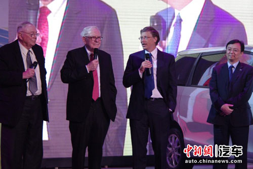 隨著一輛銀色的比亞迪M6緩緩駛上舞臺(tái),巴菲特、王傳福以及比爾·蓋茨、查理·芒格在閃爍的鎂光燈和全場(chǎng)關(guān)注的目光中依次走出M6,笑容可掬的巴菲特甚至朝著M6豎起大拇指。