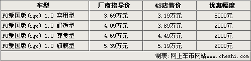 據(jù)比亞迪汽車(chē)4S店銷(xiāo)售人員介紹,比亞迪F0愛(ài)國(guó)版igo系列車(chē)型的現(xiàn)車(chē)并不是很齊全,實(shí)用型和舒適型都有現(xiàn)車(chē),尊貴型和旗艦型則需要預(yù)訂,大概10-15天即可提車(chē)。而目前1.0L實(shí)用型和舒適型都有現(xiàn)車(chē),其中實(shí)用型可以?xún)?yōu)惠5000元,而其他車(chē)型只可以?xún)?yōu)惠2000元現(xiàn)金。