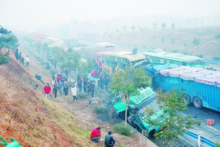 前天上午9時許,滬陜高速商城至固始段突起大霧,該路段商城服務區(qū)東800米處10余輛汽車發(fā)生連環(huán)相撞,造成1人死亡。
