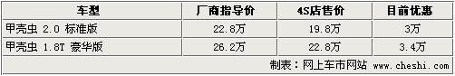據(jù)4S店銷售人員介紹:目前甲殼蟲硬頂版本車型共有2款,2.0升與1.8T車型店內(nèi)均有現(xiàn)車,2.0升車型目前顏色較為齊全,有綠色、紅色、米色、黑色、藍(lán)色車款,最高可優(yōu)惠3萬元,1.8T車型指導(dǎo)價(jià)改為26.2萬元,優(yōu)惠后僅為22.8萬元。