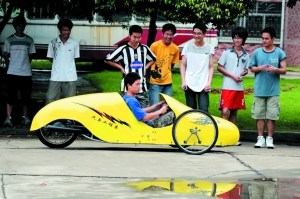 日前,廣西工學(xué)院汽車(chē)工程系4名學(xué)生設(shè)計(jì)制成一輛新型環(huán)保車(chē),每百公里耗油僅1.2升。該車(chē)最快時(shí)速能達(dá)到65公里。這輛環(huán)保車(chē)除了發(fā)動(dòng)機(jī)外,全為手工制作,車(chē)身用玻璃鋼材料制成,零件是學(xué)生自己動(dòng)手焊接而成。該車(chē)前輪為兩個(gè)自行車(chē)輪胎,后輪為摩托車(chē)輪胎。整車(chē)重量為37.5公斤,造價(jià)不足5000元。