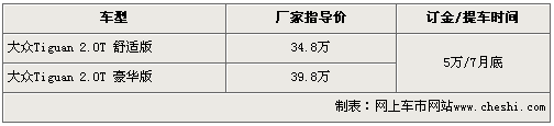 據(jù)銷售人員表示,途歡Tiguan進(jìn)口車型目前已接受預(yù)訂,訂金為5萬元,最快在7月份左右可以提到現(xiàn)車。無論途歡Tiguan舒適版還是豪華版兩款車型,都將標(biāo)配四輪驅(qū)動系統(tǒng)。
