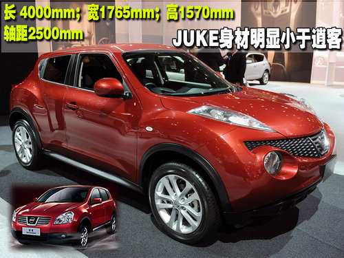日產(chǎn)JUKE車身尺寸為:長4000mm;寬1765mm;高1570mm,從車身尺寸上看,全新的Juke的明顯小于日產(chǎn)逍客Qashqai,完全符合其入門級的定位。JUKE的軸距為2500mm,比逍客短了130mm,意味著它的內(nèi)部空間將相對比較緊湊。