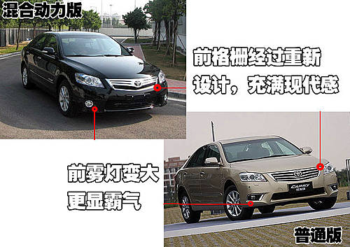 這款混合動力版凱美瑞的整體造型與普通版凱美瑞相同,但前臉部分設(shè)計變得更加前衛(wèi),猶如飛翔的翅膀;旌蟿恿P美瑞采用了圓形前霧燈,加大的設(shè)計不僅使整車顯得更為霸氣,而且更突出的前進氣隔柵。