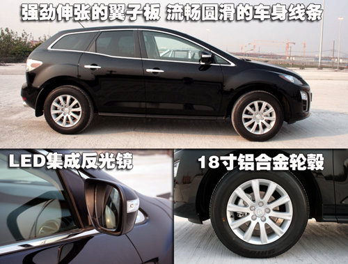 強(qiáng)勁有力的翼子板在車身中部得以適量的過度,其在車尾部再次伸張,配以車窗周圍的鍍鉻裝飾條,賦予了CX-7更為前衛(wèi)的定義。車身整體線條設(shè)計(jì)流暢圓潤,反光鏡集成了LED轉(zhuǎn)向燈,最為顯眼的當(dāng)屬輪轂,CX-7裝配了18寸多幅鋁輪轂,并配備了普利司通高級(jí)輪胎,為高速穩(wěn)定性及駕駛安全性起到了關(guān)鍵作用。