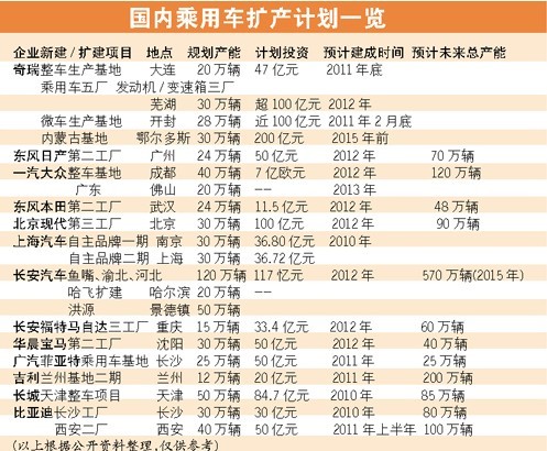 如此龐大的產(chǎn)能擴(kuò)充計(jì)劃讓相關(guān)各方憂心忡忡。今年年初,工信部向國(guó)內(nèi)車企下發(fā)了《關(guān)于調(diào)查汽車生產(chǎn)企業(yè)投資項(xiàng)目有關(guān)情況的通知》,通知要求車企上報(bào)現(xiàn)有產(chǎn)能情況和2010年~2015年產(chǎn)能規(guī)劃和投資情況。市場(chǎng)的火爆讓“產(chǎn)能過(guò)!钡膽n患呼聲逐漸熄滅,對(duì)部分廠家而言,最核心的任務(wù)仍然是增加產(chǎn)能。