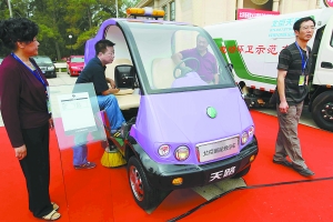 一踏上北京展覽館門前的小廣場,參觀者便立刻被露天擺放在廣場上的各種新能源汽車吸引住了?雌饋硭坪鹾推胀ɡ嚊]什么兩樣的桶裝垃圾運輸車與壓縮式垃圾車,實際上卻是靠電池來運行的;北汽的新能源汽車最高時速已經(jīng)可以達到每小時160公里;小型電動汽車“竹風”只需要30分鐘即可快速充電80%……