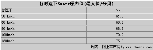 也許有人會(huì)擔(dān)心smart這么小的車隔音和密封性是否有問(wèn)題,為此我們?cè)诒本┍彼沫h(huán)路中關(guān)村附近進(jìn)行了測(cè)試,在車外我們測(cè)得了最高77分貝的環(huán)境噪聲;而當(dāng)我們進(jìn)入到車內(nèi)噪聲指數(shù)立即下降了22分貝之多,55分貝的水平幾乎達(dá)到了辦公室的安靜程度。