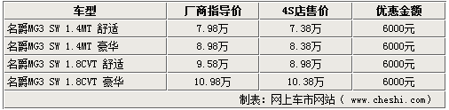 時(shí)值銷售旺季,各廠商紛紛拿出看家本領(lǐng)提高銷量。網(wǎng)上車市網(wǎng)站由經(jīng)銷商處了解到,現(xiàn)在到店購買MG3 SW系列車型僅優(yōu)惠6000元,相比前一段時(shí)間的萬元優(yōu)惠有大幅度的縮水。具體詳情如下: