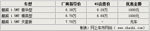 長城酷熊作為長城汽車在市場上推出的第三款轎車產(chǎn)品,憑借極具個性的造型和寬大的內(nèi)部空間,使很多消費(fèi)者都對其非常感興趣。新車價格分別為豪華型6.39萬元、精英型6.79萬元,天窗版7.79萬元。近日,網(wǎng)上車市網(wǎng)站了解到,長城汽車4S店處的天窗版酷熊仍然是有價無車的狀態(tài),其他兩款車型有現(xiàn)車銷售,可以給出千元的優(yōu)惠。具體詳情如下: