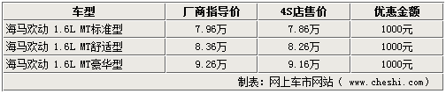 海馬歡動1.6L系列車型已經(jīng)上市有段時間了,售價在7.96萬至9.26萬之間。網(wǎng)上車市網(wǎng)站由北京地區(qū)經(jīng)銷商處了解到,現(xiàn)在購車均有千元的現(xiàn)金優(yōu)惠。另外一款上市時間較長的1.8L系列車型 ,全系車型則最高可給出9千元的現(xiàn)金優(yōu)惠。具體詳情如下: