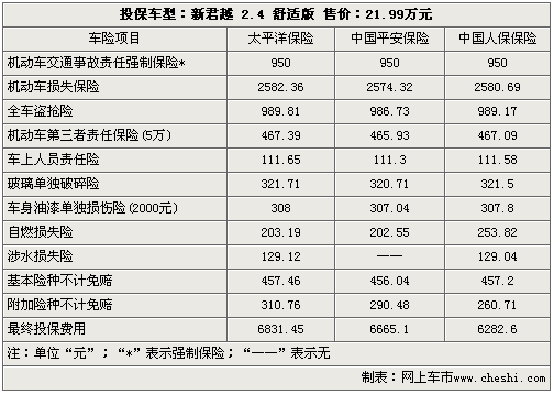 繼別克新君威上市后新一代君越也于日前正式投放國內(nèi)市場,全系5款車的售價(jià)為21.99萬-31.99萬。那么在購買別克新君越后,其保險(xiǎn)又將如何選擇呢?下面我們將北京地區(qū)太平洋、平安、中保三家保險(xiǎn)公司對新君越入門車型的投保費(fèi)用進(jìn)行詳實(shí)解析,以便為您購車提供一定的參考。